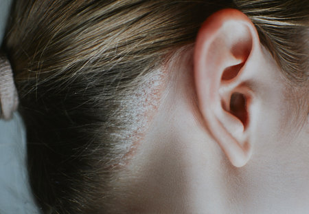 Psoriasis on a woman's head close-up with redness and peeling. High quality photo