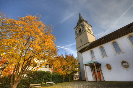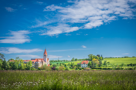 Traditional white wooden church on a green hill in central Switzerland near Zurich