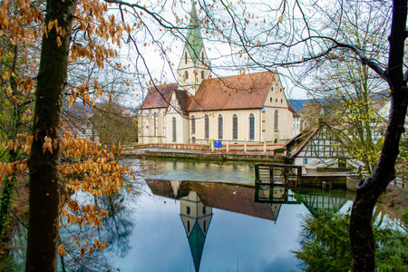 The monastic church of the former Blaubeuren Benedictine Abbey, founded around 1085, seen across the Blautopf, the karst spring of the Blau river, in Blaubeuren, Baden-Wurttemberg, Germany.