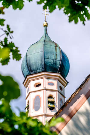 Colomanskirche or Saint Coloman Church, in Baroque style. Close-up of the bell tower and the roof. Schwangau, Allgau, Bavaria, Germany