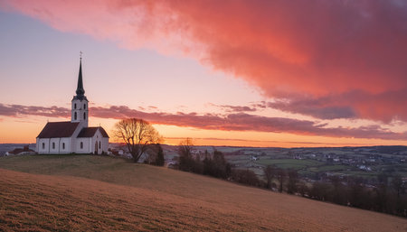 Church on the hill at sunset. Landscape with church and sunset sky.