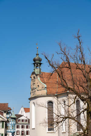 Saint Gallen, Switzerland March 9, 2022 Historic old abbey catholic church in the city center on a sunny afternoon