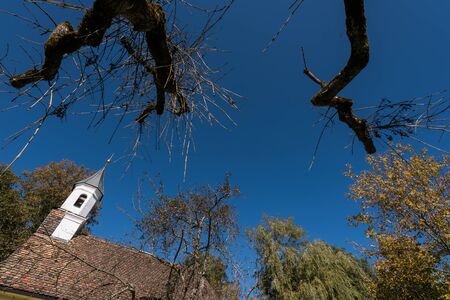 Small town rural Reformed Christian Church with bell tower and analog clock sunny summer day green vegetation 2020