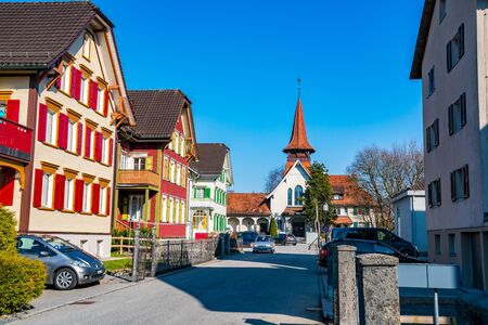 AppENZELL, SWITZERLAND -MARCH 24, 2018 : View of colorful house and the church at Appenzell Village in Switzerland