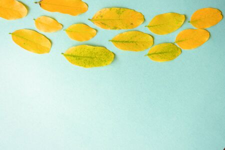 Autumn composition. Fall colorful leaves framed on blue paper background. Top view with copy space. Flat lay
