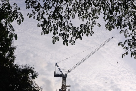There are high-rise buildings being built.building construction, scaffolding, and lifting building supplies with a construction crane