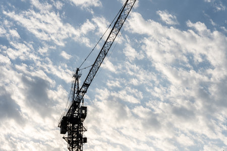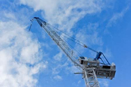 Arrow of construction crane for against blue sky with clouds for building of the new very high house. For background use. Lots of place for writing text
