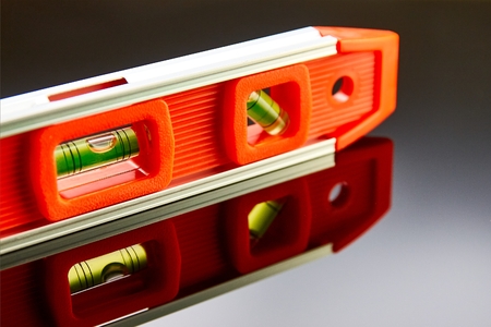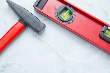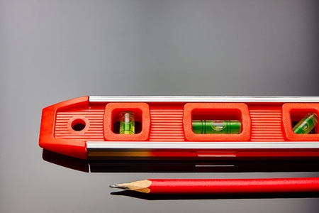 Handyman background with red and black level on distressed whitewash background with copy space for home repair or maintenance message