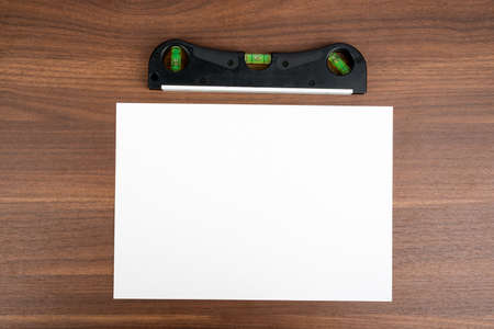 Blank card with level on wooden table