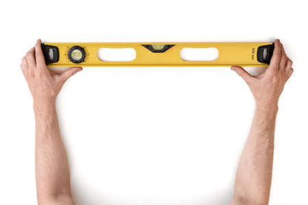 Close-up view of man's hands holding yellow building level isolated on white background. Building and construction. Repairing. DIY concept.