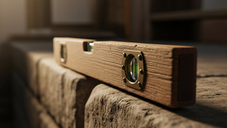 Green spirit level resting on concrete blocks at a construction site, ensuring precise measurements and alignment for ongoing building projects and renovations