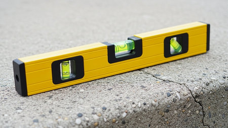A close-up view of a standard level tool resting on a weathered concrete surface, perfect for illustrating construction measurement and home improvement projects.