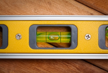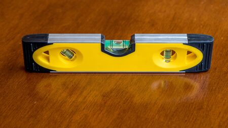 Yellow bubble level showing bubble in the level position to indicate a flat plane, resting on a brown wooden surface