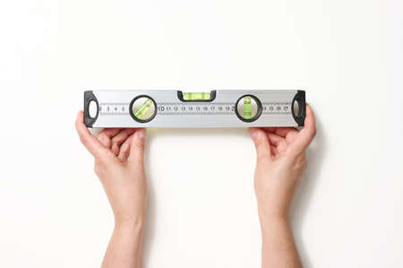 Close up of female hands horizontal holds building bubble spirit level isolated on white background. Instruments for renovation apartment room. Repair home concept. Copy space for advertisement
