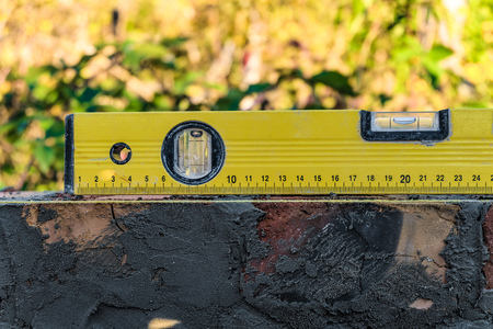 Yellow spirit level on the road. Construction and repair work concept.