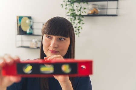 Confident architect caucasian woman with a spirit level in the foreground. High quality photo
