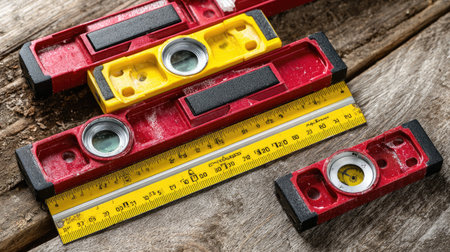 This image features vibrant spirit levels in red and yellow along with a measuring tape on rustic wood. Perfect for showcasing tools in construction or DIY contexts.