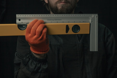 joiner hand holding yellow water level and angle ruler device isolated on black background close-up Tool concept design advertising