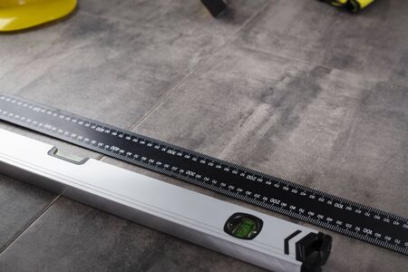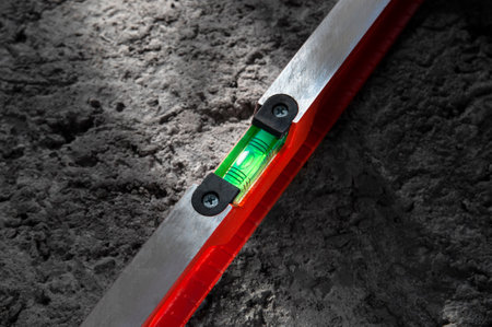 Construction spirit level tool on cement floor