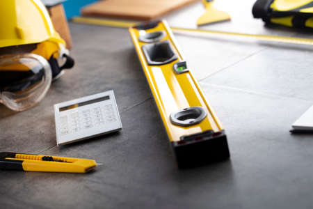 Contractor concept. Tool kit of the contractor: yellow hardhat, libella, hand saw. Plans and notebook on the gray tiles background.