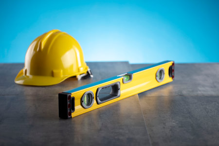 Contractor concept. Tool kit of the contractor: yellow hardhat and libella on the gray tiles and on the blue background.