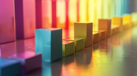A striking arrangement of colorful geometric blocks creates a vibrant visual experience. Reflections on the surface enhance the artistic composition with soft lighting.