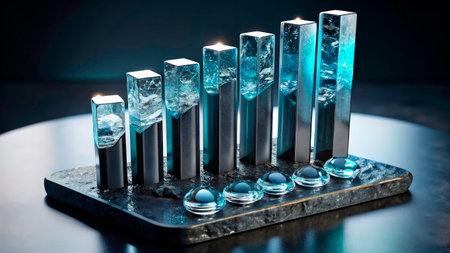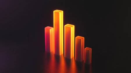 A D bar chart depicting yearly growth statistics, with bars arranged in ascending order, accented by soft glows that highlight each bar's height.