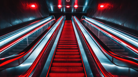 Dramatic night shot of outdoor escalator glowing with red and white lights
