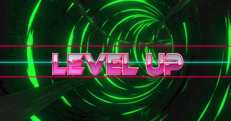Image of level up text over moving digital tunnel. image game, entertainment and digital interface concept digitally generated image.