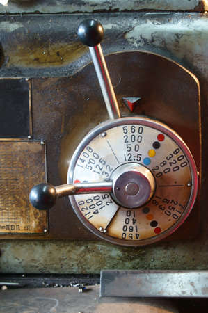 Part of lathe in workshop is close-up. Old lathe for metal processing stands in factory premises. Industrial background.