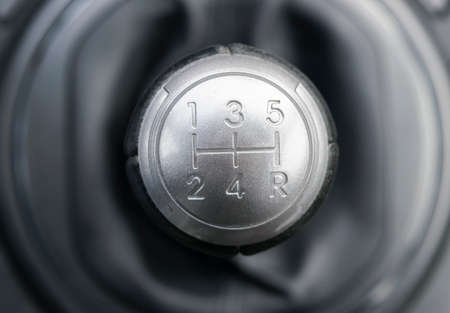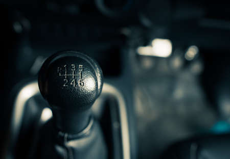 Manual transmission in the car, six gears in the car, gear lever in the car close up.