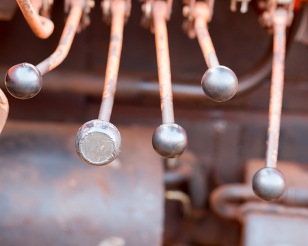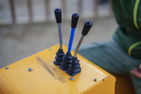 Close-up of operating levers of crane truck hydraulic control system. Lift for construction works at height.