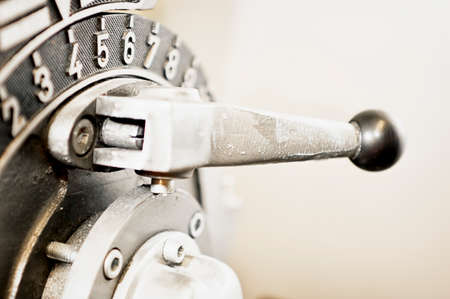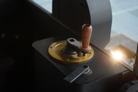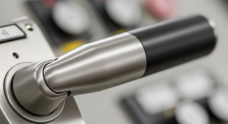 A detailed close-up of a metallic control lever on an industrial machine's control panel. The brushed metal and black handle sits in a technical environment with other blurred dials, representing concepts of control, technology, and precision engineering.