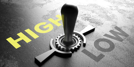 High low concept. Retro electric control switch against old industrial black background, High low text. 3d illustration