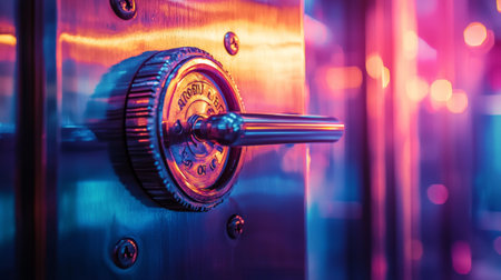 Close-up of a vault door handle illuminated with vibrant neon lights, symbolizing security, protection, and finance in an abstract style.