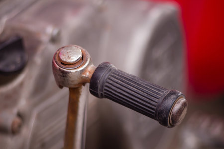 Detailed view of a vintage mechanical lever used in industrial machinery, showcasing rust, worn textures, and distinctive warning symbols. Perfect for design and engineering themes.
