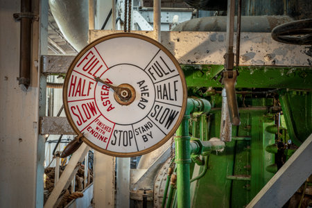 A close-up view of a vintage control lever on a ship's console, highlighting intricate details against a backdrop filled with nautical instruments and gauges.