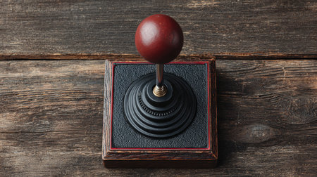 A vintage joystick sits elegantly on a rustic wooden surface, highlighting its classic design and nostalgic charm. Perfect for gaming enthusiasts and collectors.