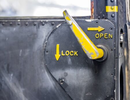 The yellow handle of the inner side of the door of the old helicopter with arrows open and closed the direction of the lock on the panel as a metaphor for the life path concluded in the right choice