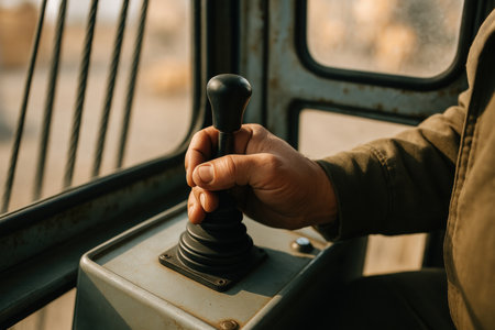 Operator's hand gripping machinery lever inside industrial vehicle cabin, demonstrating manual control and mechanical operation.