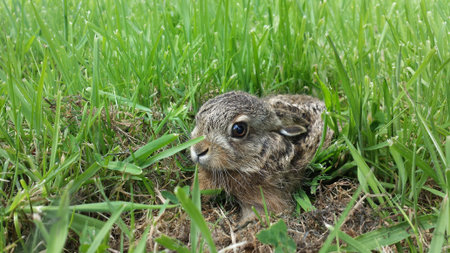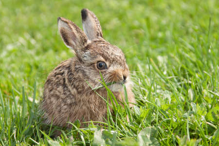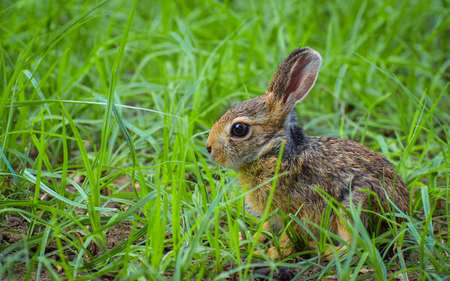 A close-up view depicts a small rabbit with brown and beige fur, large ears, and dark eyes. The animal is nestled within vibrant green grass, suggesting an outdoor setting. The image uses natural light, creating a bright and appealing visual suitable for a variety of editorial or commercial applications.