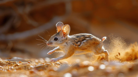 A small rodent scurrying through the loose dirt, its tiny paws kicking up small clouds of dust as it moves swiftly across the ground. The rodent appears to be foraging for food or shelter in its natural habitat.