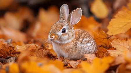 A charming rabbit rests among colorful autumn leaves, showcasing its soft fur and bright eyes. This peaceful scene captures the essence of wildlife in fall.