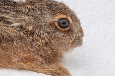 Portrait of a cute brown hare in a straw nest.