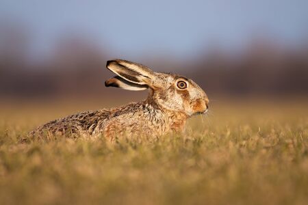 Adorable brown hare, lepus europaeus, lying on the ground and hiding in spring. Cute creature sitting on the field from profile. Animal wildlife at sunset.