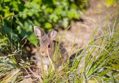 A young Eastern Cottontail Rabbit sits in the sun. This species can be seen in both urban and rural areas.