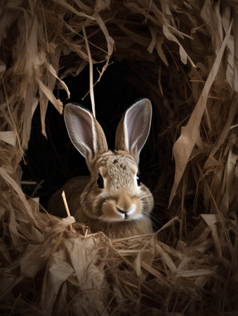 Two young rabbits snuggle closely in a cozy wooden hut packed with straw, exuding warmth and companionship. Their gentle demeanor showcases tranquility and softness.