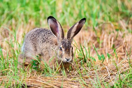 European hare cute darling young Lepus europaeus brown field meadow animal in nature, draw near village, runs fast, cubs beautiful eyes caress, agricultural landscape, hidden sitting crop Europe