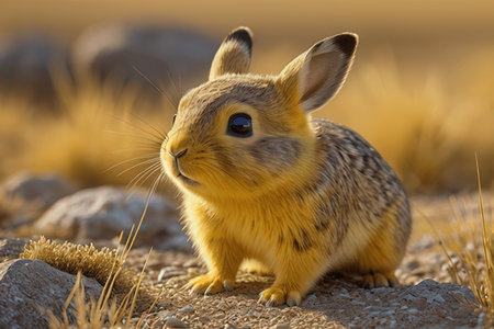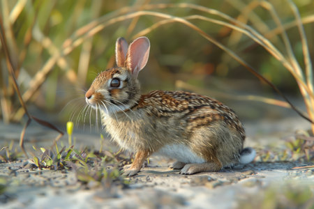 Wild Eastern Cottontail Rabbit Sitting Alert in Natural Grassland Environment during Sunset AI Generative