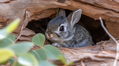 A charming rabbit peeks out from a tree hollow, surrounded by lush greenery. This adorable scene captures the essence of nature and wildlife beauty.
